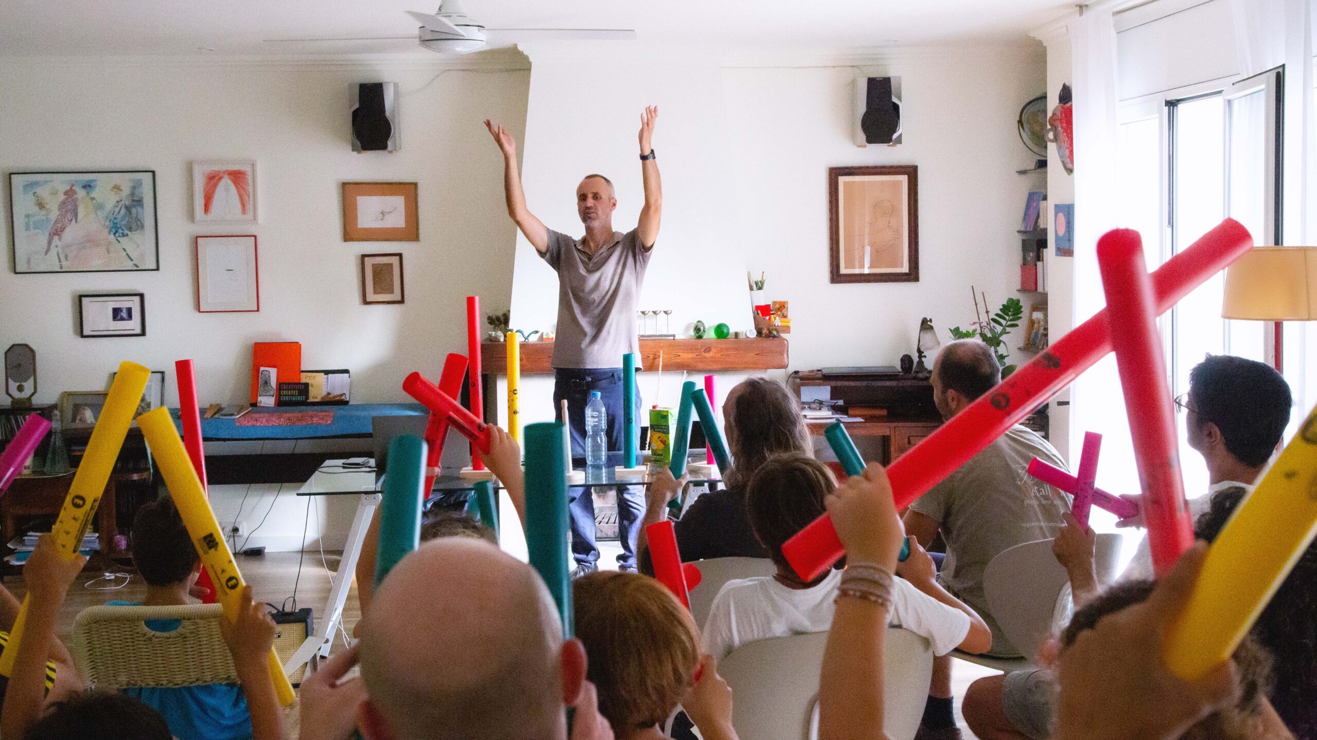 Creació d’una orquestra de tubs Boomwhackers entre tots els participants. Fomenta l’harmonia, l’escolta activa, la creativitat, el lideratge i el treball en equip. No cal saber res de teoria musical ja que les notes es diferencien per colors. Aprenentatge totalment intuitiu.